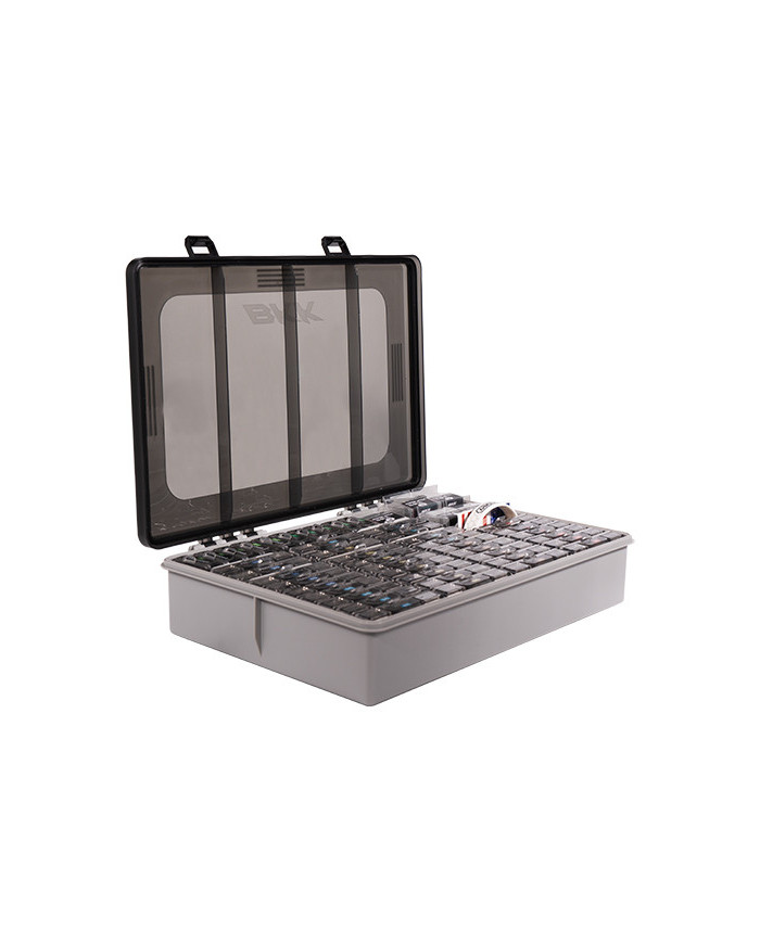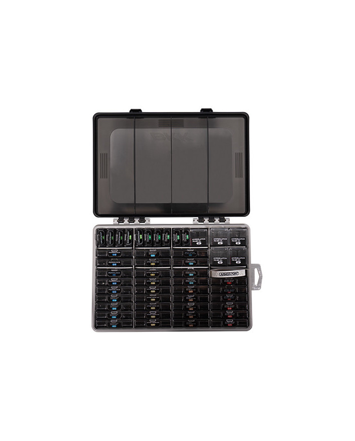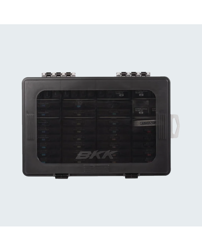 KK OCD Tackle Storage System Fully Loaded Pre-loaded with 48 different Armor Point hooks and storage boxes, the BKK OCD Tackle Storage System Fully Loaded provides anglers with a one-stop tackle solution for a wide range of conditions and applications. An optimized containment device for BKK Armor Point hooks or fishing accessories, the OCD tackle storage system uses a front and side labelling system that allows you to instantly identify the contents for quick and effortless tackle selection Designed with unique compartments to hold Armor Point Hook Accessory boxes or the original backer card box, this fully adjustable storage box allows anglers to customize up to 80 small boxes, 44 medium boxes, or any combination in between. Built from a heavy-duty polypropylene material for improved durability, the soft waterproof gasket and strong latches for a watertight seal to keep the moisture out. The ultimate companion for keeping hooks and terminal tackle organized and easy to locate, the BKK OCD Tackle Storage System Fully Loaded is made to save the obsessive and compulsive tournament angler time and money. – Optimized for use with Armor Point Hook Storage Boxes – Customizable Layout – Heavy-duty Polypropylene Construction – Soft Waterproof Gasket Dimensions: 13” x 8.59” x 2.56” Includes: – (1) BKK OCD Tackle Storage Box – (48) Pre-loaded Armor Point BKK Hook Storage Accessory boxes – (2) BKK OCD Armor Point Hook and Accessory Box
