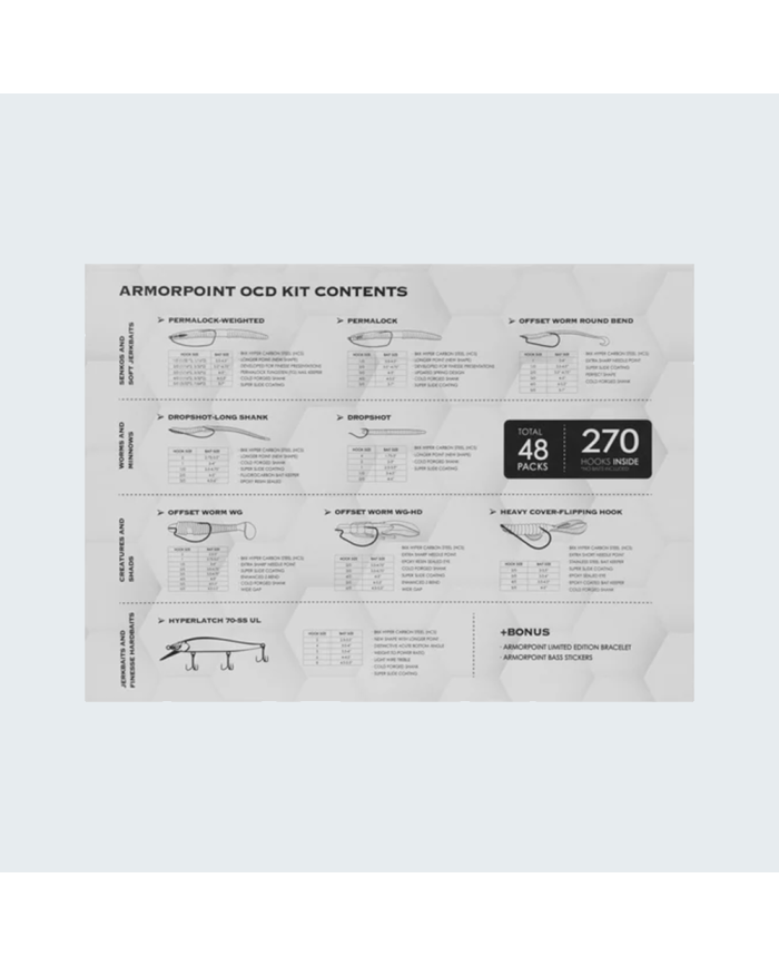 The Fully Loaded OCD Tackle Storage System is engineered for anglers who demand precision, efficiency, and reliability. This comprehensive kit includes 48 preloaded Armor Point hook packs, totaling 270 premium hooks, all meticulously organized within a rugged, waterproof storage box. Whether you’re drop shotting, flipping, or rigging jerkbaits, this system ensures you’re prepared for any fishing scenario.