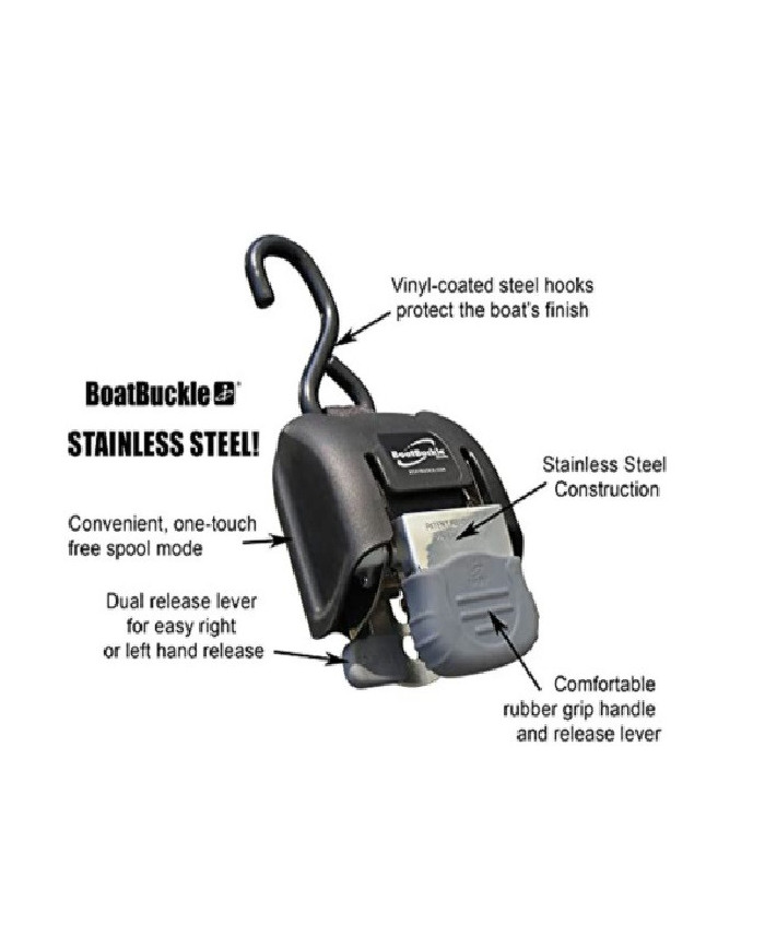 With automotive style webbing, anti-corrosive construction, and sturdy coated hooks, BoatBuckle Retractable Ratcheting Tie-downs are still the ultimate tie-down system in convenience, style and innovative trailer boat rigging!