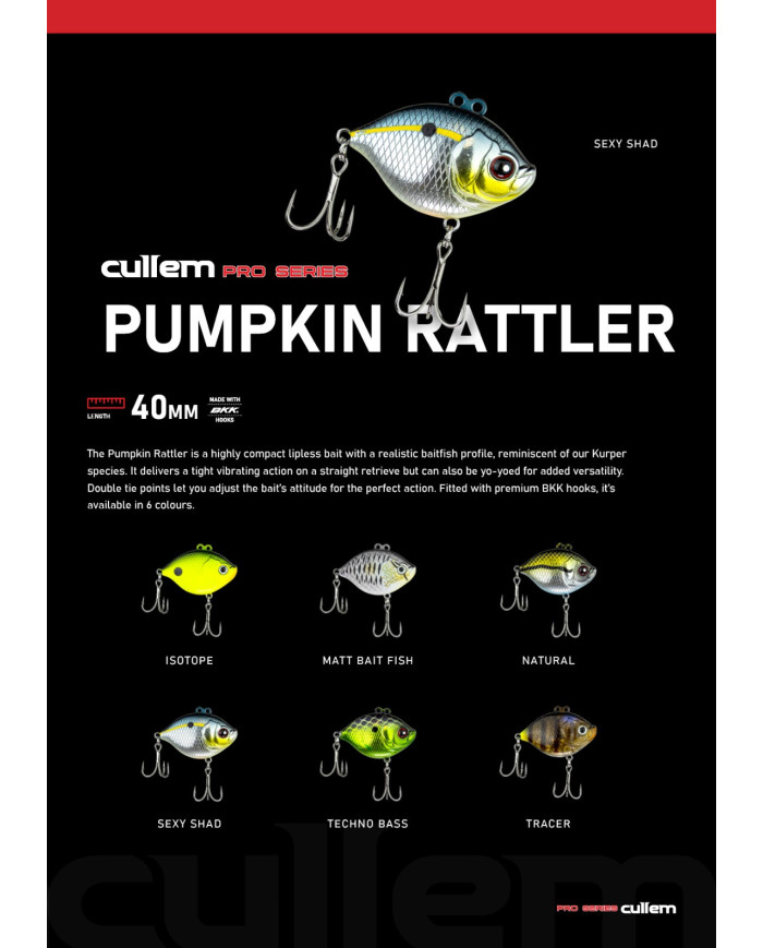 The Pumpkin Rattler is a highly compact lipless bait with a realistic baitfish profile, reminiscent of our Kurper species.
