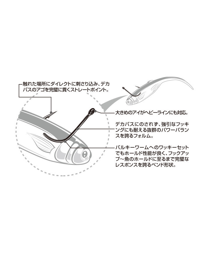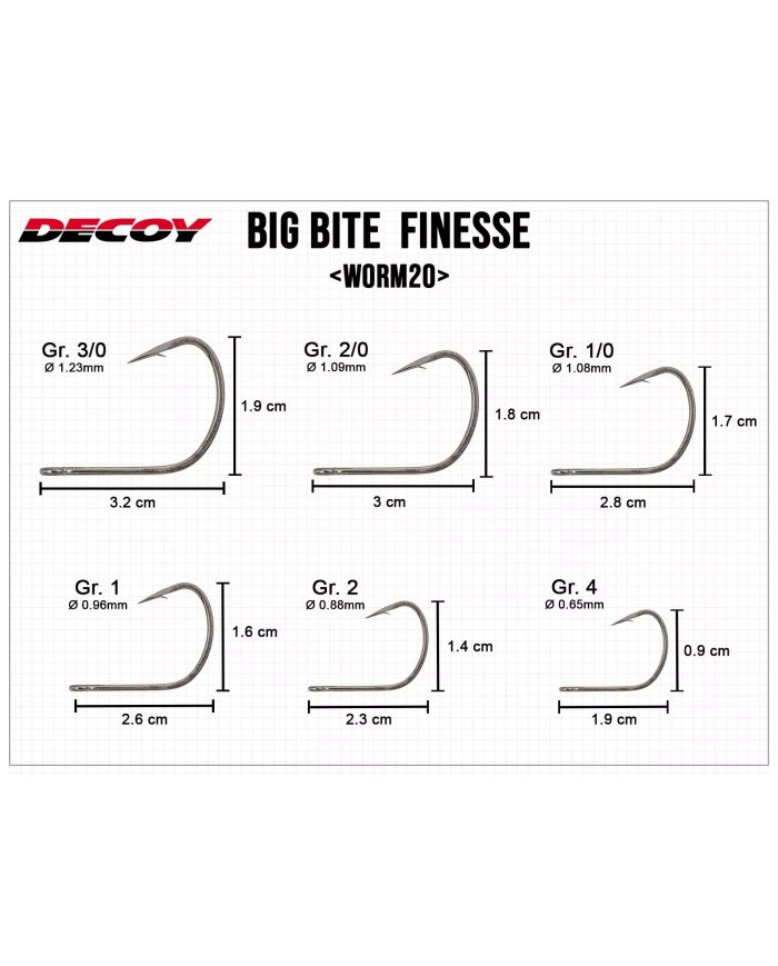 Strong enough to handle big fish, yet small enough for finesse baits, the Decoy Big Bite Finesse Worm20 Hook offers anglers a super-sharp option for rigging smaller plastics when fish are feeding lighter. Whether you’re wacky-rigging, neko-rigging, or dropshotting, the Decoy Big Bite Finesse Worm20 Hook is built with a short shank and a wide gap that accommodates a broad range of soft plastics. Manufactured using high-carbon steel, the Decoy Big Bite Finesse Worm20 Hook is the perfect choice for catching big bass with a small bait.
