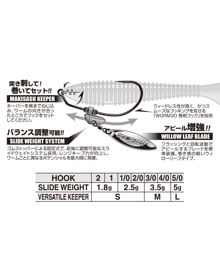 The "WORM230G" uses the "Makisa Keeper" which has a very high worm hold and is easy to set straight, and comes standard with a removable sinker "SLIDE WEIGHT".