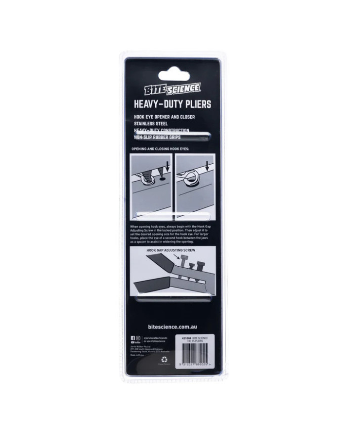 Packed with functionality, these pliers are equipped with a wire cutter, hook remover, large and small crimpers, a hook eye opener and closer, and a fish hook holder—making them the ultimate multi-purpose tool for rigging and on-the-water adjustments. As with all Bite Science tools, ensure lasting smooth operation by washing after use and applying a light coating of oil to the hinge.