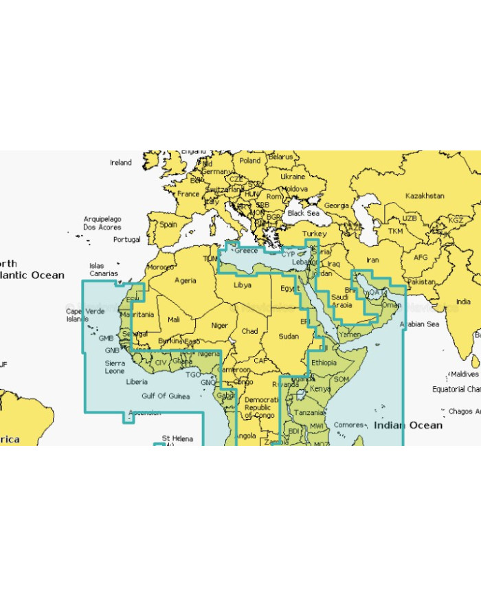 Coastal coverage of the coast of Africa from Tripoli, Libya thru the Red Sea and around the Cape to Dakar, Senegal including the Suez Canal and the Levant, the coast of the Arabian Peninsula, the Persian Gulf, Madagascar, Socotra, Zanzibar, Reunion, Mauritius, the Seychelles, the Comoros, the Prince Edward Islands, Tristan de Cunha, St Helena Island, Ascension Island, the Cape Verde Islands, Malta and Cyprus. Coverage of ports such as Alexandria, Egypt; Djibouti; Manama, Bahrain; Dubai; Cape Town, South Africa and Lagos, Nigeria are included.