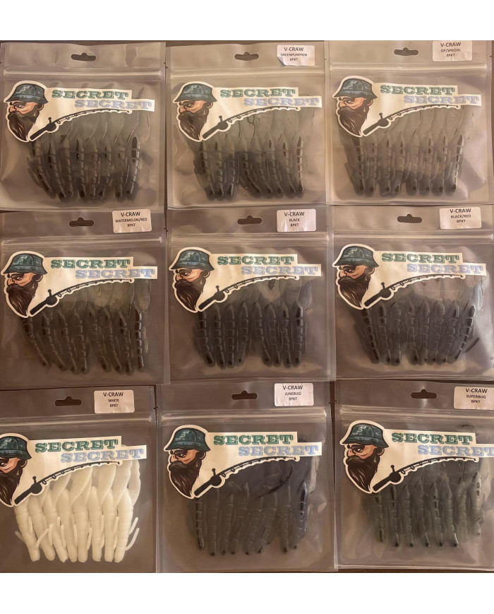- Meticulously designed and produced, the Secret Secret V Craw ensures top-quality performance, designed to cover water on Carolina Rigs, punch with Heavy Texas, or swim on various hooks.