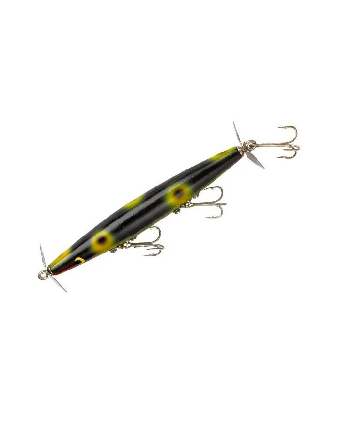 The propellers at the front and tail of the lure can be adjusted to throw more water and work slower, or bent back for a quicker, quieter retrieve.