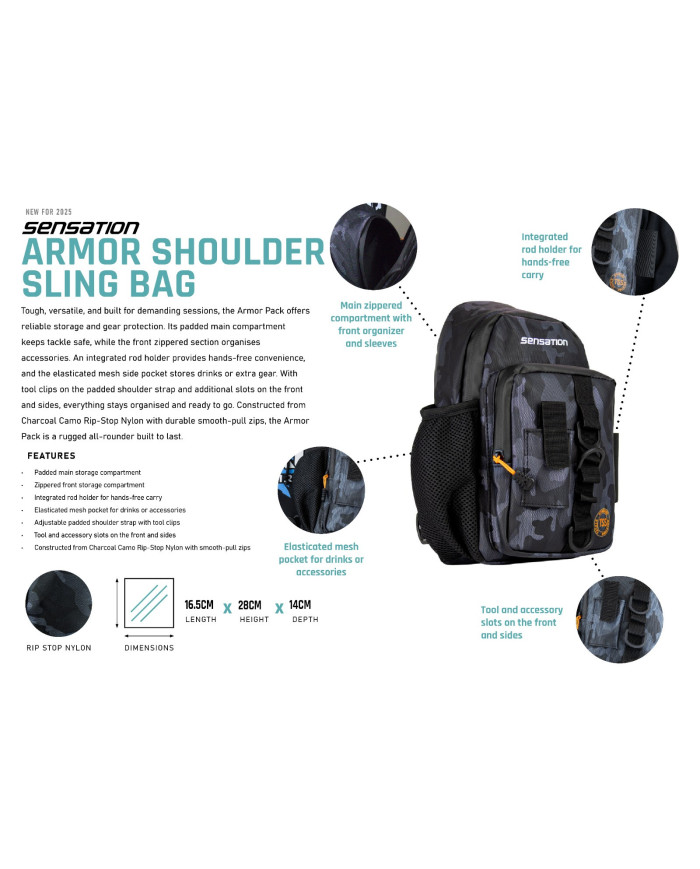 Constructed from Charcoal Camo Rip-Stop Nylon with durable smooth-pull zips, the Armor Pack is a rugged all-rounder built to last.