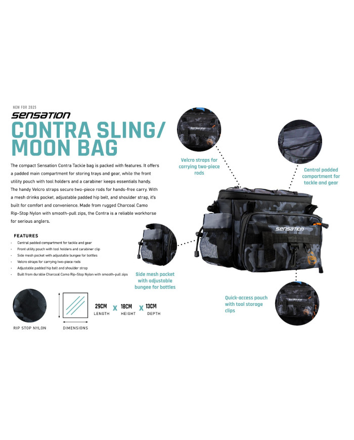 Made from rugged Charcoal Camo Rip-Stop Nylon with smooth-pull zips, the Contra is a reliable workhorse for serious anglers.