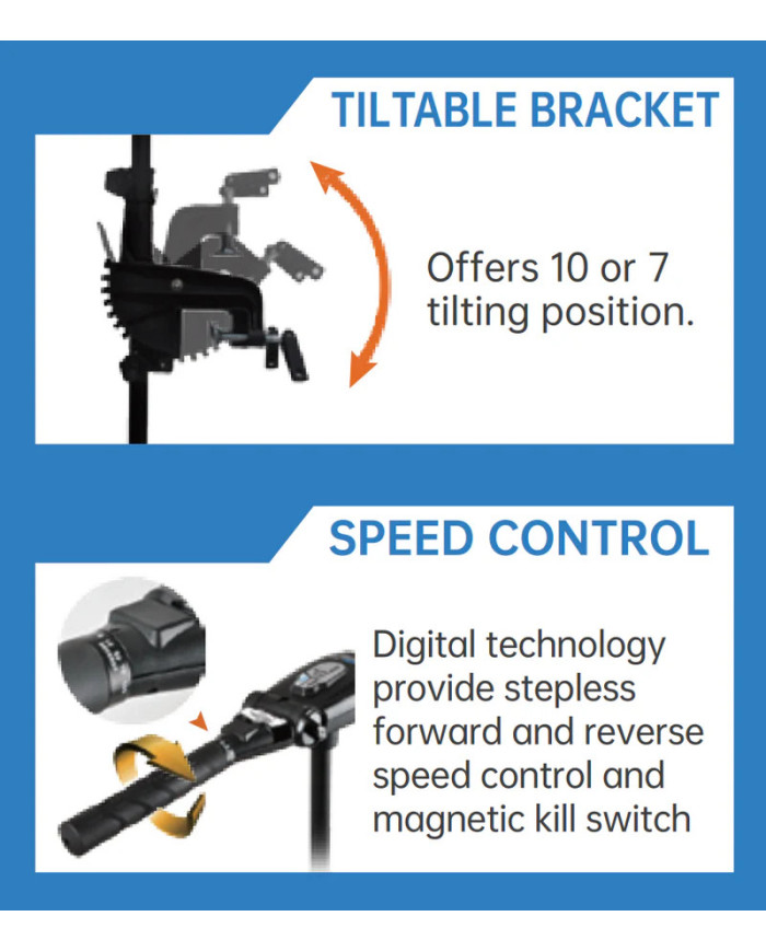 They are equipped with step-less speed control for forward and reverse models. The motor can be easily tilted as well as height adjusted for different water depth, allowing you to use it in most water levels.