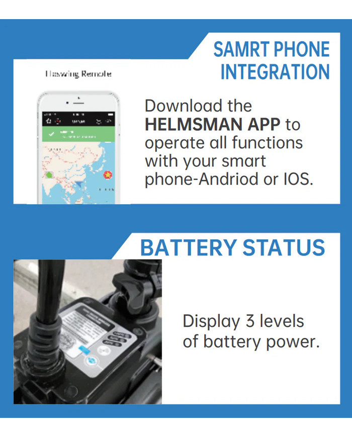 Additionally, the machine can be connected to smart phones through specially developed software. HELMSMAN APP offers functions such as electronic anchor, GPS intelligent navigation system, heading lock, route recording replay and cruise control.